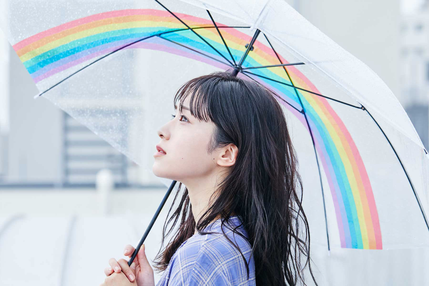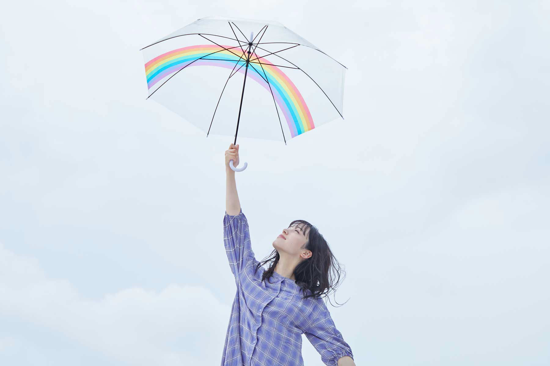 空に向かって軽やかに虹をさす女性は女優の小牧那凪さん from 太田プロダクション。
